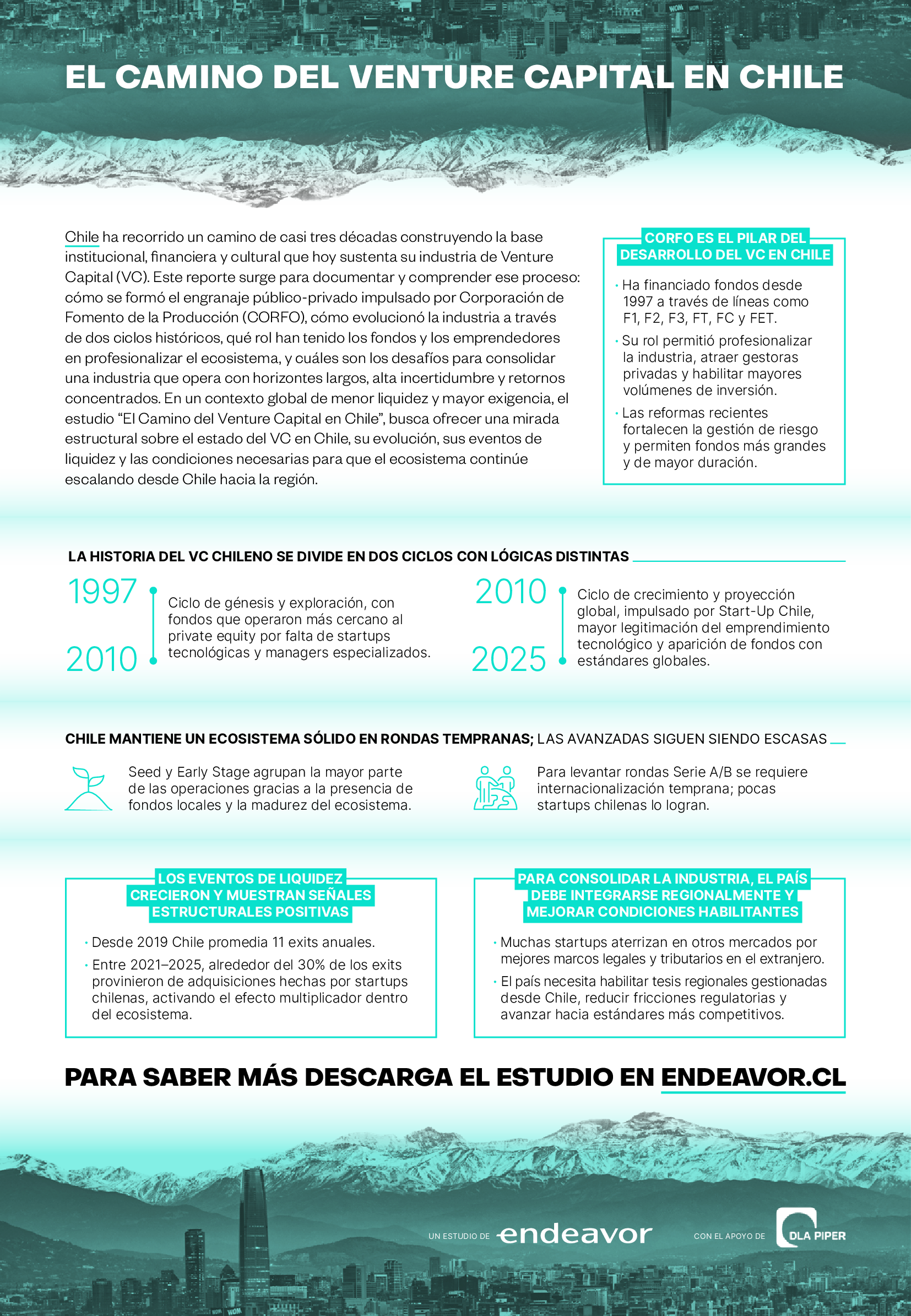 El capital de riesgo es uno de los principales motores del desarrollo del ecosistema emprendedor en Chile. Este estudio, desarrollado por Endeavor Research con el apoyo de DLA Piper, analiza cómo ha evolucionado la industria de capital de riesgo en las últimas tres décadas, el rol clave de la política pública en su surgimiento y las grandes etapas que han marcado su camino: desde un ecosistema naciente y muy tradicional hasta uno más sofisticado, con potencialidad de expansión internacional y un creciente efecto multiplicador. Entender esta trayectoria es fundamental para impulsar un mercado de capital de riesgo robusto, competitivo y estratégico para el futuro de Chile y su ecosistema.