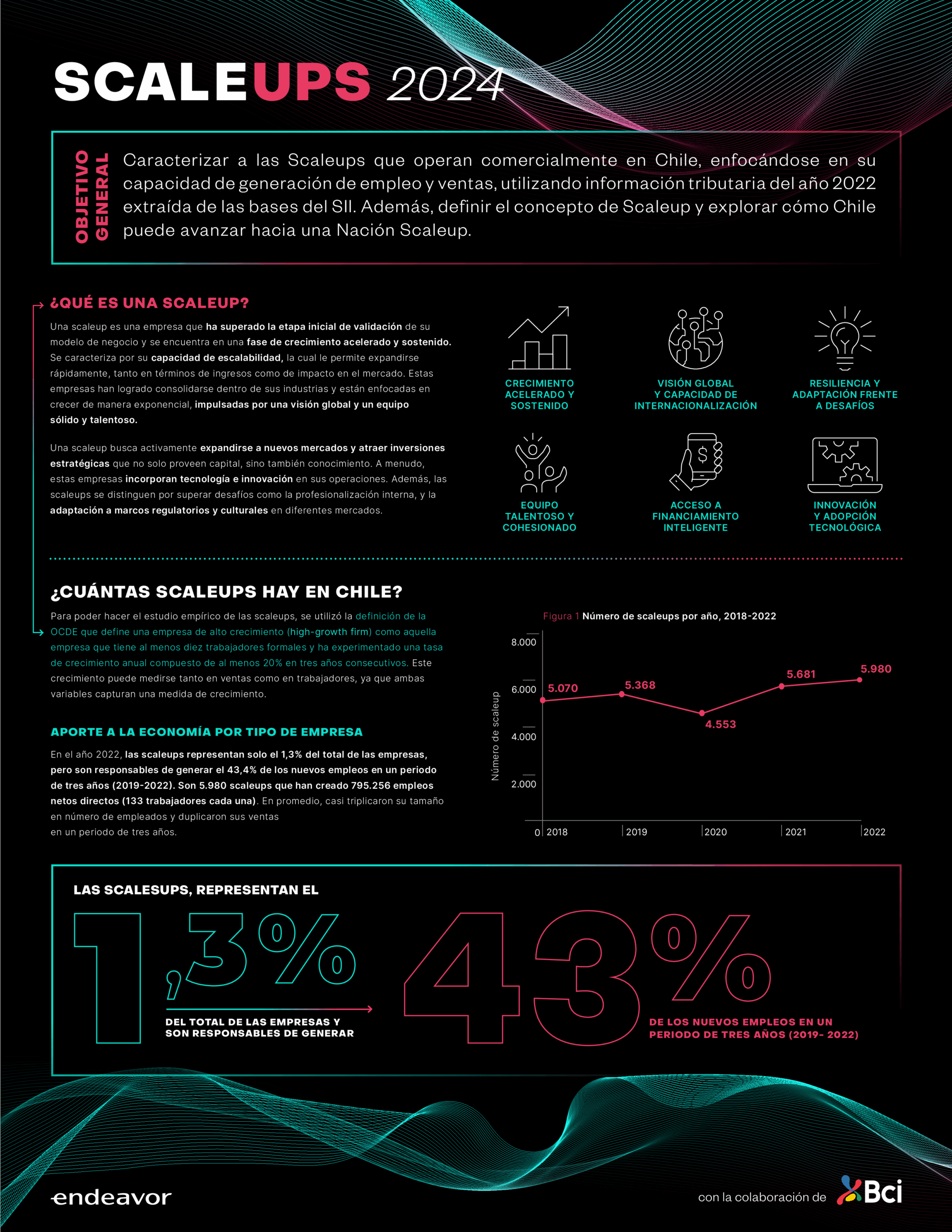 Las scaleups están transformando Chile. Aunque representan solo el 1% de las empresas en el país, generan un impresionante 43% de los empleos formales. En números, esto se traduce en 5.980 scaleups que han creado 795.256 puestos de trabajo. Este estudio de Endeavor Research caracteriza a las scaleups en Chile y define cuáles son los principales desafíos que enfrentan en el ecosistema nacional, además de resaltar el impacto crucial que tiene este selecto grupo de empresas en la economía, demostrando que su crecimiento y desarrollo son fundamentales para el futuro de Chile.